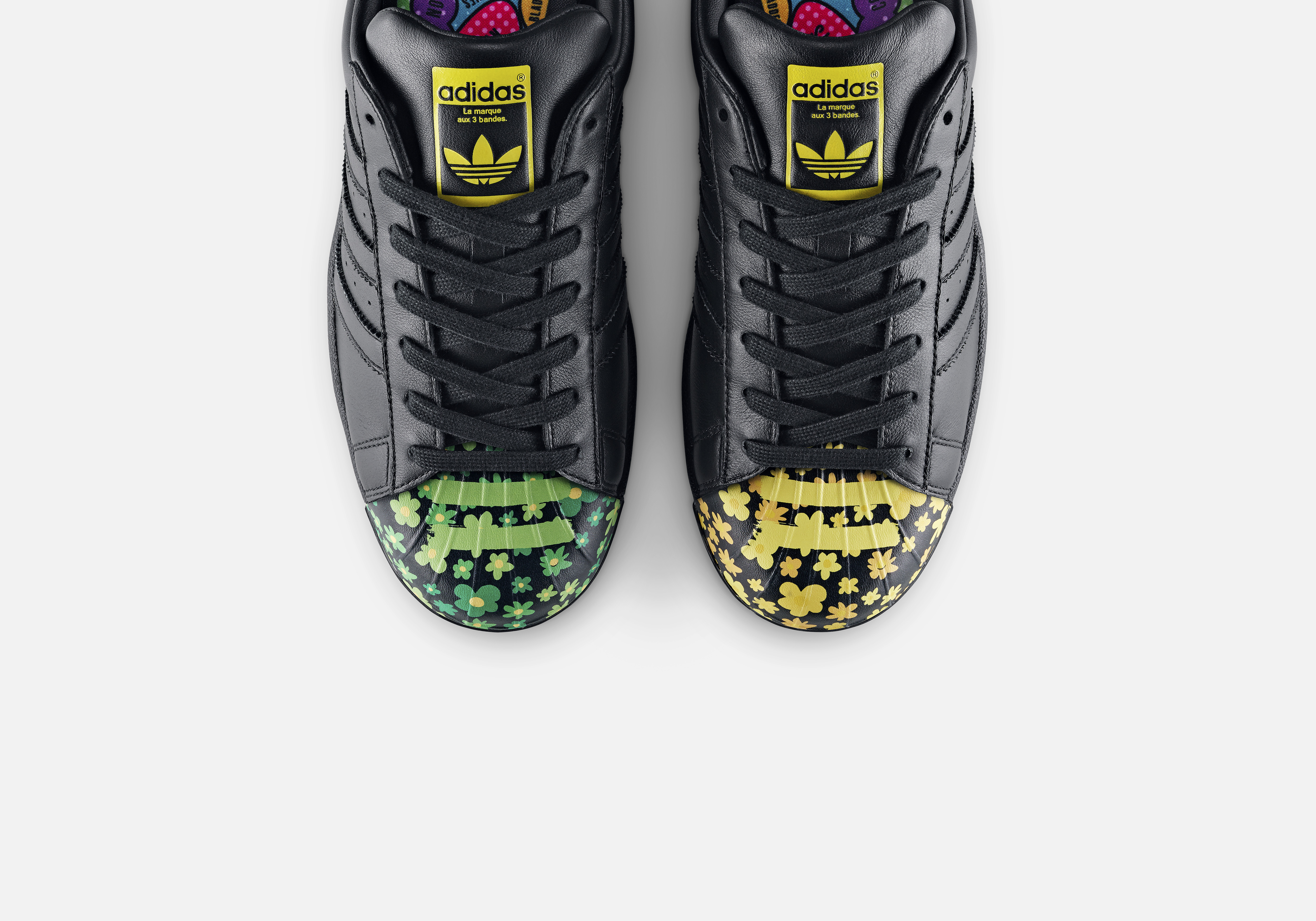 Debuting with the Artwork Collection, Supershell brings art and creativity to the Superstar like never before. The Superstar’s Shelltoe comes alive with signature graphic artworks and designs from NYC contemporary artist Todd James, American photographer-director Cass Bird and contemporary Japanese artist Mr.. The artists’ designs are then joined by six of Pharrell’s very own artworks that explore life force and energy and its relationship with color.