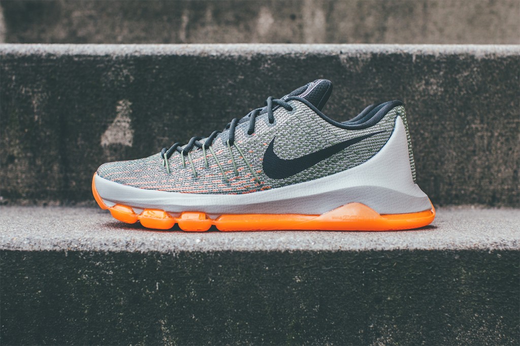 Easy Money Sniper… Well that is obviously not the name of these but that’s generally what influenced the colorway, sort of. The upcoming Nike KD 8 ‘Easy Euro‘ is a follow up to last years KD 7 ‘Easy Money‘ but the inspirations are somewhat different. The ‘Easy Euro’ colorway which is Lunar Grey/Squadron Green-Alligator-Bright Citrus is said to have been inspired by KD’s recent European Tour. Now I am sure there will be more background information provided by Nike as this week moves on but until then, with a release date scheduled for this weekend October 17, 2015 check out the latest detailed pictures below.