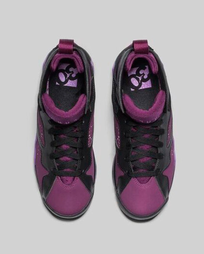The next girls’ exclusive Air Jordan 7 Retro features a mulberry Durabuck upper, black laces and pops of Wolf Grey and Fuchsia Glow across the silhouette..