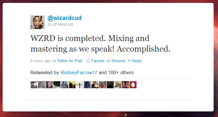 Kid Cudi stated on his Twitter that his upcoming rock album WZRD with producer Dot Da Genius is officially finished and coming January 30th. He also says he’s working on Man On The Moon III, which he hopes to have Common narrate, similar to his debut album.