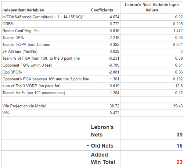 I would argue that the three coefficients that I highlighted in black will remain stagnant despite LeBron’s presence. For the remaining independent variables, I’ll propose a new value to implement into the model and attempt to justify the choice. From there, we can produce a LeBron-adjusted value, subtract it from the Nets’ current extrapolation (16-66), and find out if our answer is congruent with our 20-game addition hypothesis.