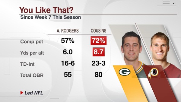 Since the “You Like That” game Kirk Cousins has tossed 23 touchdowns compared to 3 interceptions, a stat that would have boggled your mind before the season started. Cousins has been one of the most efficient quarterbacks all season and has been steadily improving all season long under the tutelage of Jay Gruden. One could make the argument that you would rather have Cousins right now. Part of the reason that could be true is there is extreme turmoil between Aaron Rodgers and his head coach. His teammates have also revealed in the past Rodgers is not the easiest man to get along with. In terms of who’s playing better down the stretch there is no reason to pick against Washington.