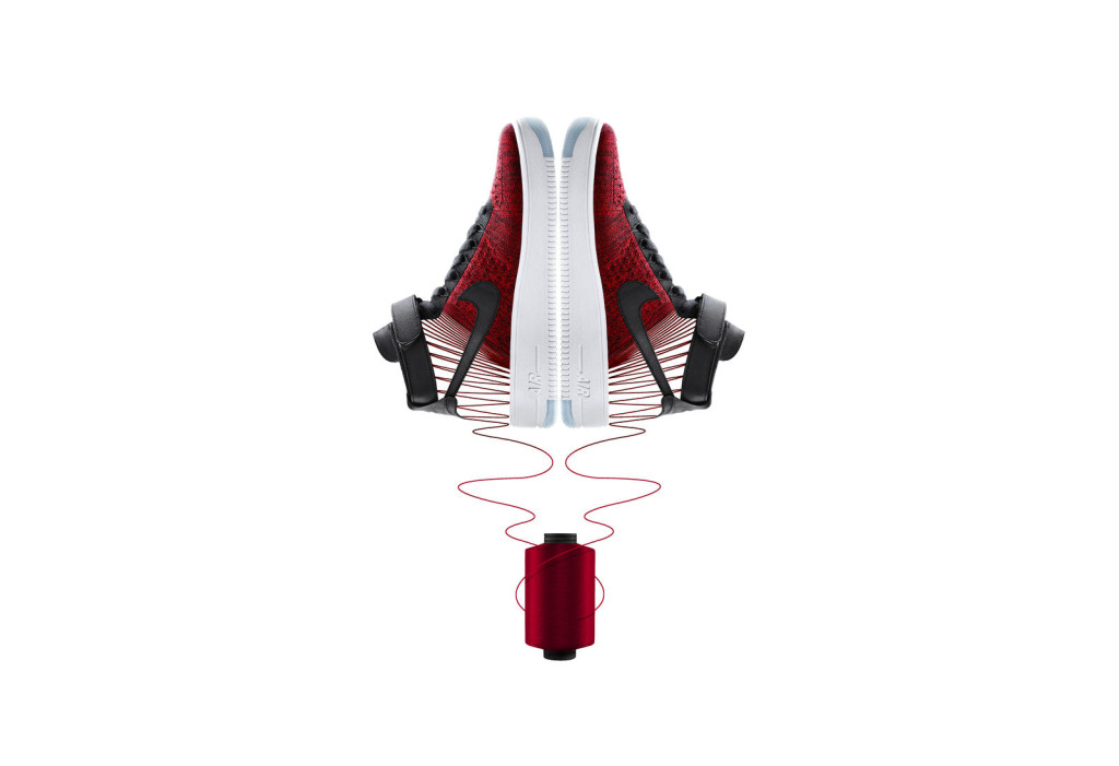When applying Flyknit, the teams collaborated to engineer the exact structures and textures necessary to maintain the shape and paneling of the original Air Force 1. They focused on keeping the original stance of the tip, saddle, foxing and vamp, as well as the perforations in the vamp, by programming thicker, firmer yarn on the raised tip and undulating eye stay. Flyknit technology enabled the design team to precisely micro-engineer every stitch to create the featherweight upper for maximum comfort and minimal weight, while it also reduced manufacturing waste and the amount of material used. The shoe became not only the lightest Air Force 1 ever made, approximately half the weight of the original, but also the first Flyknit shoe to include a leather Swoosh logo.
