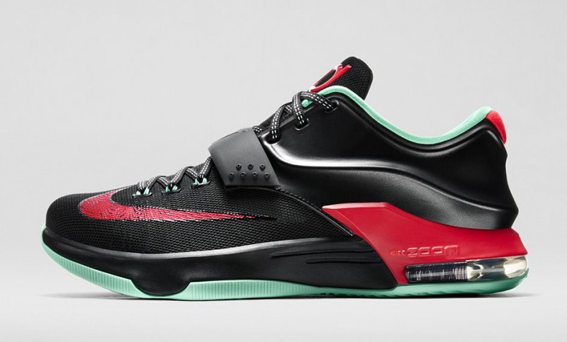 The much anticipated Nike KD7 “Good Apples” will be hitting stores this weekend and it’s a great looking colorway with an interesting story behind it. As the release’s nickname would imply, these kicks are inspired by apples. Kevin Durant, the shoe’s namesake, compares a basketball court to an apple orchard and shots to apples. He takes only the good shots/apples and leaves the bad ones. Given that Durant has won the NBA scoring title four out of the last five years, we would tend to give KD’s metaphor the benefit of the doubt. A mostly black upper is hit with Action Red (red apples) and Medium Mint (green apples) accents all around.