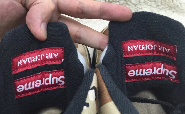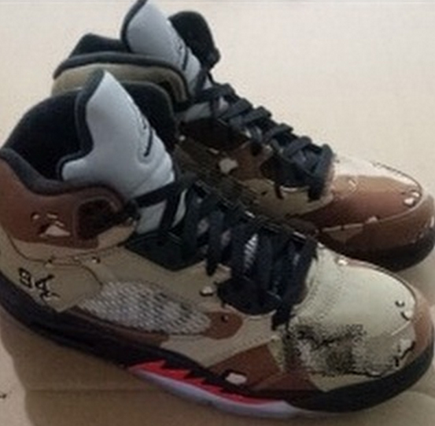 A Supreme and Jordan Brand collaboration has hit the internet. By the looks of the pictures, it seems to be some truth to it and apparently this has been confirmed by Supreme and Jordan Brand. The Supreme x Air Jordan 5 can be seen to be dressed up in desert camouflage with SUPREME logo in the netting of the 5 as well as the usual 23 has been replaced with 94 which is the year that Supreme brand first started.