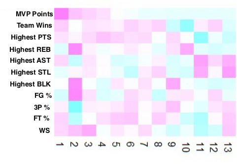 (Heatmap for various categories in 2010-11 MVP Candidacy; red = impressive, blue = relatively unimpressive. Candidates 1-13: D. Rose, D. Howard, L. James, K. Bryant, K. Durant, D. Nowitzki, D. Wade, M. Ginobili, A. Stoudemire, B. Griffin, R. Rondo, T. Parker, C. Paul)