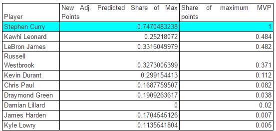 - Also, the predicted share (of max MVP points)’s total sum for the 2015-16 candidacy is greater than the actual sum of real shares (of maximum MVP points) which cannot happen. The sum of the actual share of max MVP points is 2.601, and it must be this way to account for the 131 voters, each with 5 choices. So, we also scale the unadjusted values with a reorganizing ratio to meet this mark.